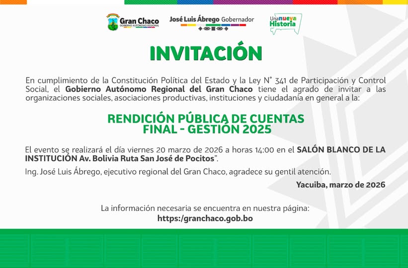 El GOBIERNO AUTÓNOMO REGIONAL DEL GRAN CHACO tiene el agrado de invitar a las organizaciones sociales, asociaciones productivas, instituciones y ciudadanía en general a la RENDICIÓN PUBLICA DE CUENTAS FINAL – GESTION 2025.